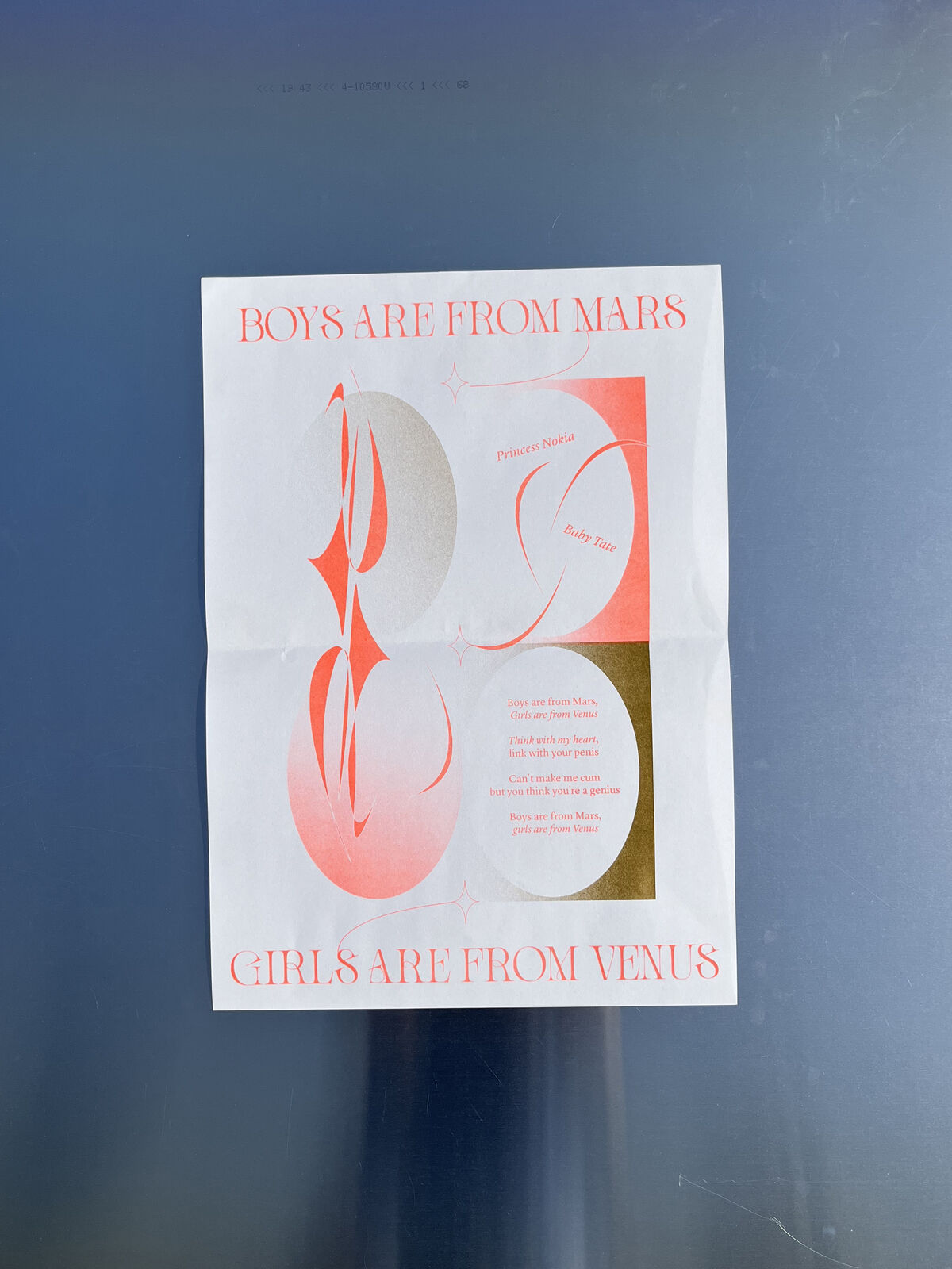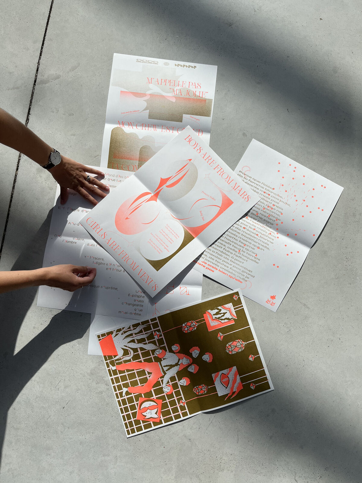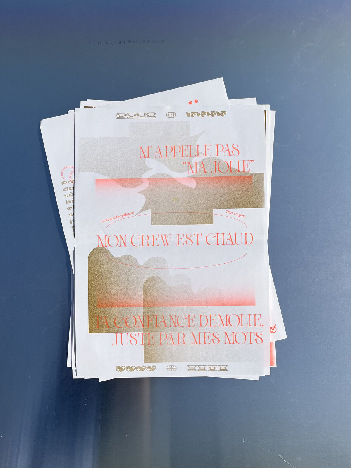 Édition de 6 affiches imprimées en risographie, deux couleurs, d’après les écrits de Virginie Despentes, Gérard d’Houville alias Marie de Heredia ou de Régnier et Irene. Ainsi que les musiques des rappeuses Princess Nokia et Lous and the Yakuza. Au recto on retrouve des compositions graphiques textuelles et visuelles associées à chaque oeuvres des femmes artistes et au verso les références des ouvrages ainsi que le contenu intégral des paroles de musique de rap. Format A3, 15€/l'édition ; 6 affiches, 8€/l'affiche orange et gold, reliure élastique A4, 30 éditions limitées numérotées.