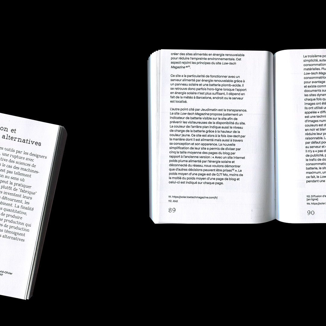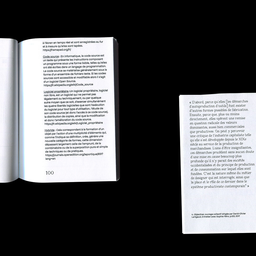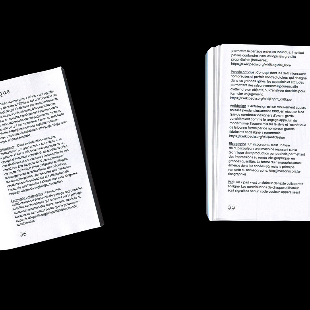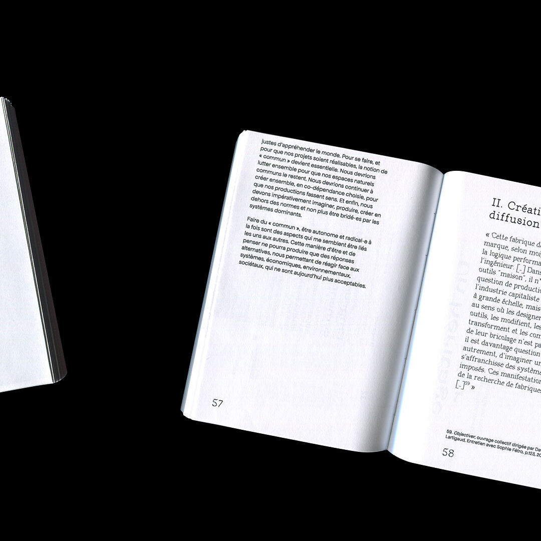 Mémoire de DNSEP en design graphique réalisé à l'ESAD de Valence en 2022. Il traite des questions de l'alternatif en design, que ce soit d'ordre écologique, économique, politique ou social. Les notions d'engagement, de radicalité y sont très importantes. Aussi j'y aborde la notion d'autonomie, non pas d'autonomie complète mais, comme je l'appelle dans ce mémoire, de co-dépendance choisie. On retrouve dans ce mémoire les questions liées aux outils libres, aux moyens d'échanges non-monétaire, aux espaces de travail et aux manière de travailler alternatives. Cette édition a été mise en page grâce à l'outil libre Paged.js. Tous les papiers utilisés sont des feuilles A4 déjà imprimées sur une face que j'ai récupéré au sein de mon école. Sa forme a été induite par le fait que je souhaitais aucune perte de papier : découpé en format A5 puis plié en deux.