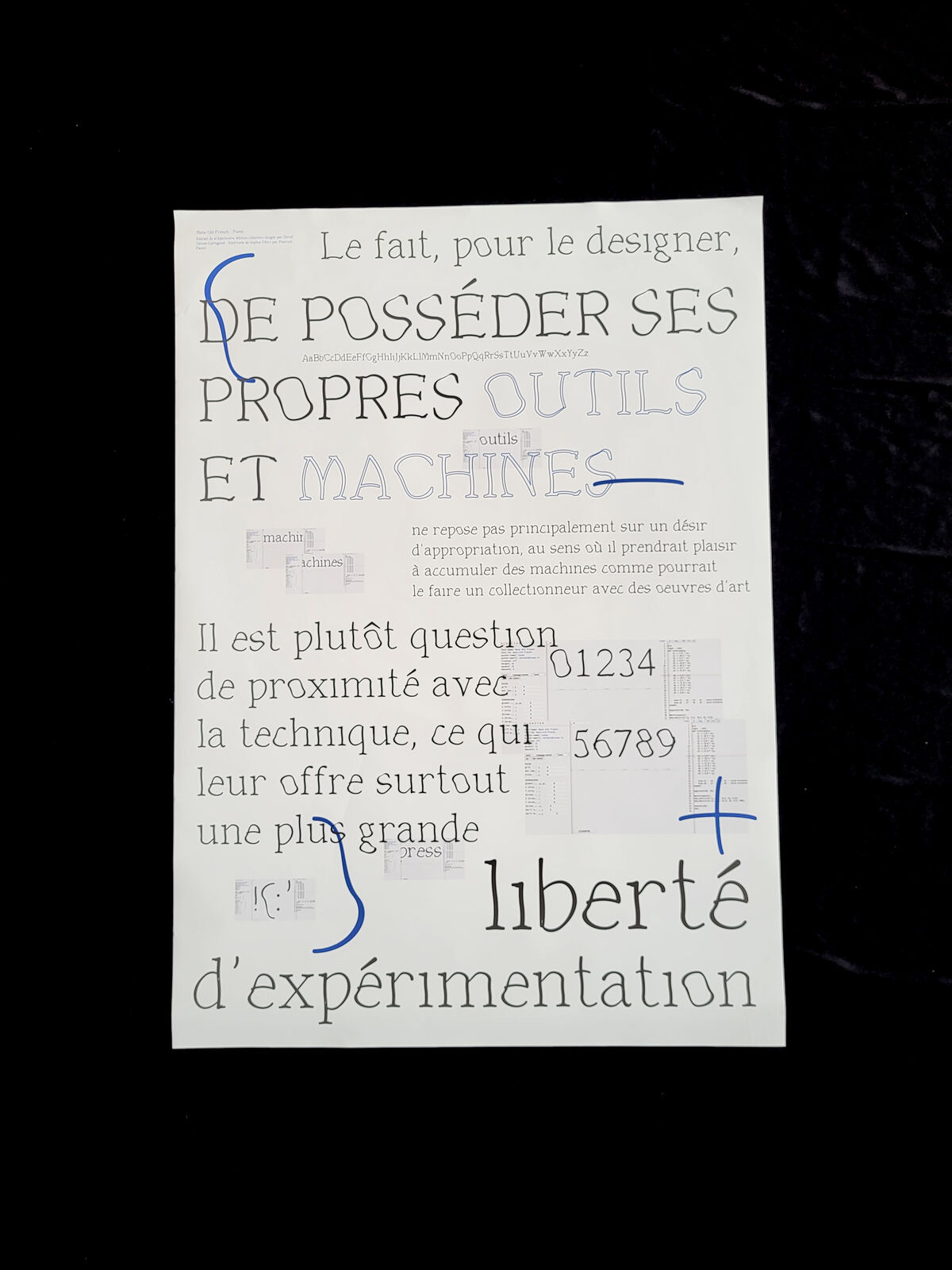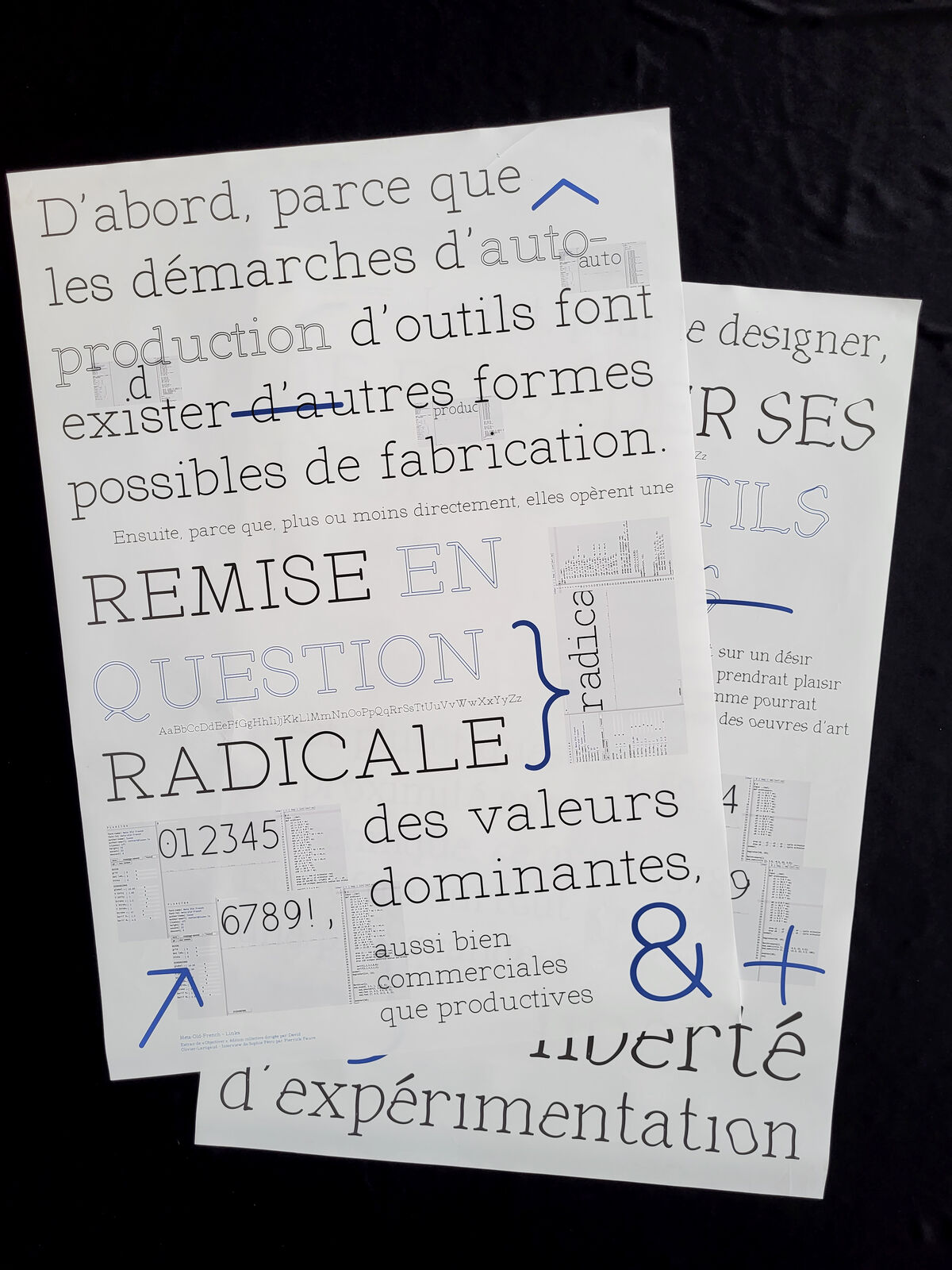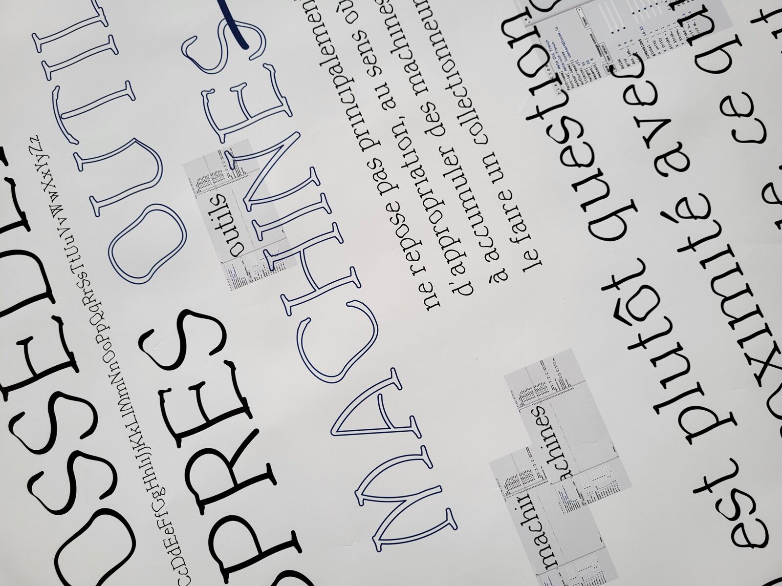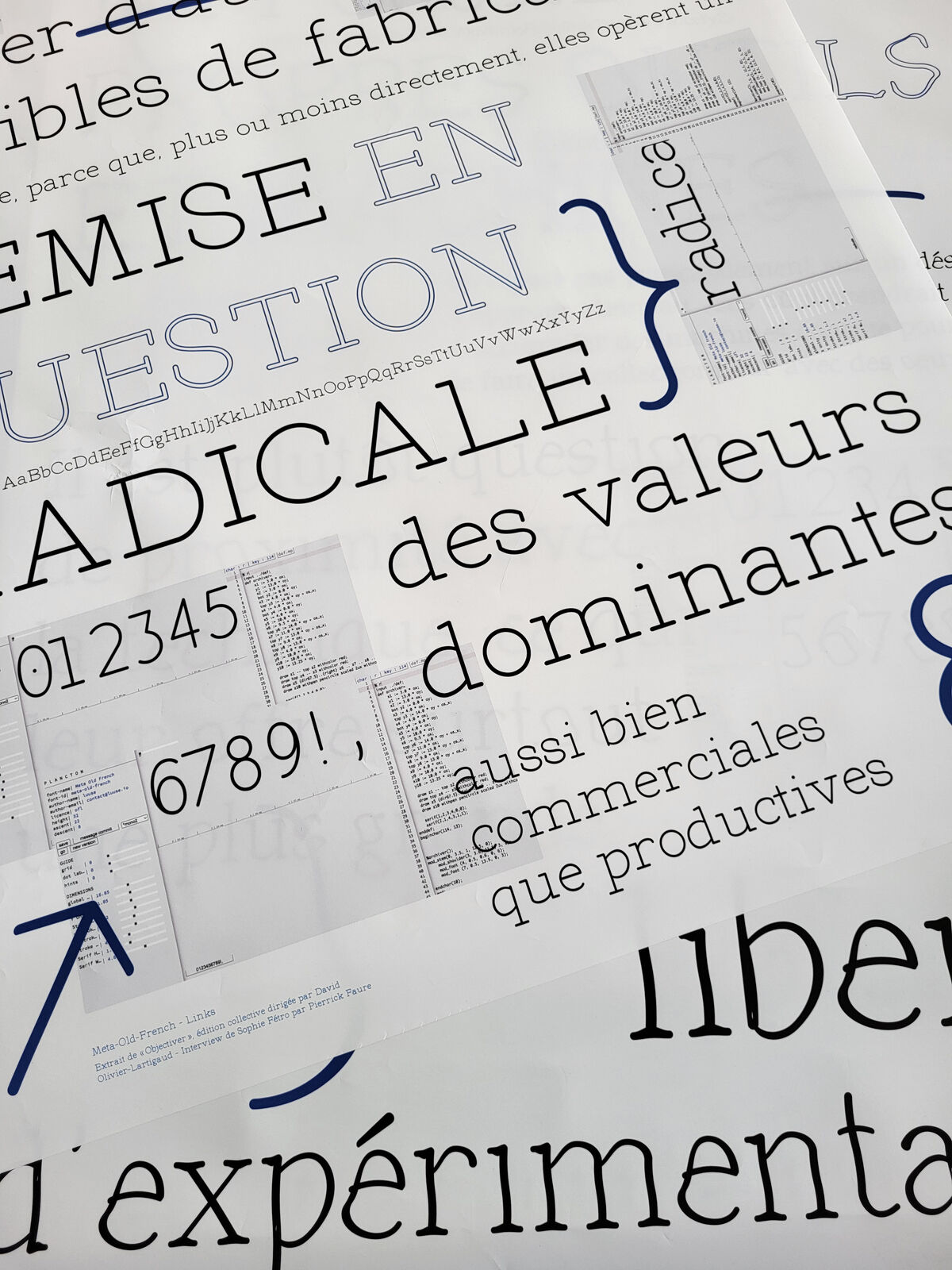 Typographies réalisées lors de mon stage chez Luuse. Ce sont des variantes inspirées du caractère Meta-Old-French regular préalablement dessiné par les designeurs de Luuse. Les version « poem » et « links » ont été dessinées sur Plancton. Outil développé par Luuse qui permet de dessiner des lettres grâce à des coordonées et non pas par les contours mais par le squelette de la lettre. Plancton utilise le langage metapost, qui dérive de metafont crée par Donald Knuth. Ce langage permet de combiner des lignes, des courbes et des points pour créer des formes, ici des lettres. Ces versions ont servis dans mon mémoire pour les sous-titres ainsi que les citations.