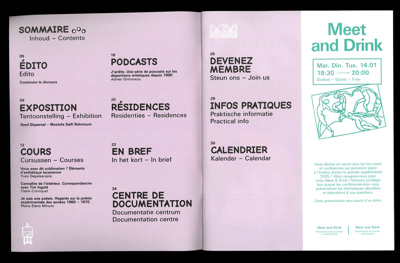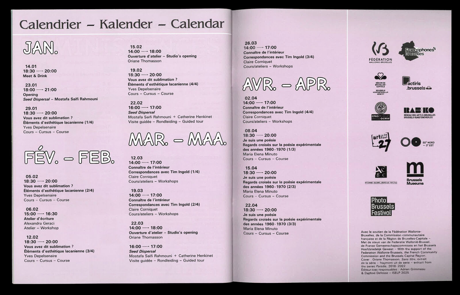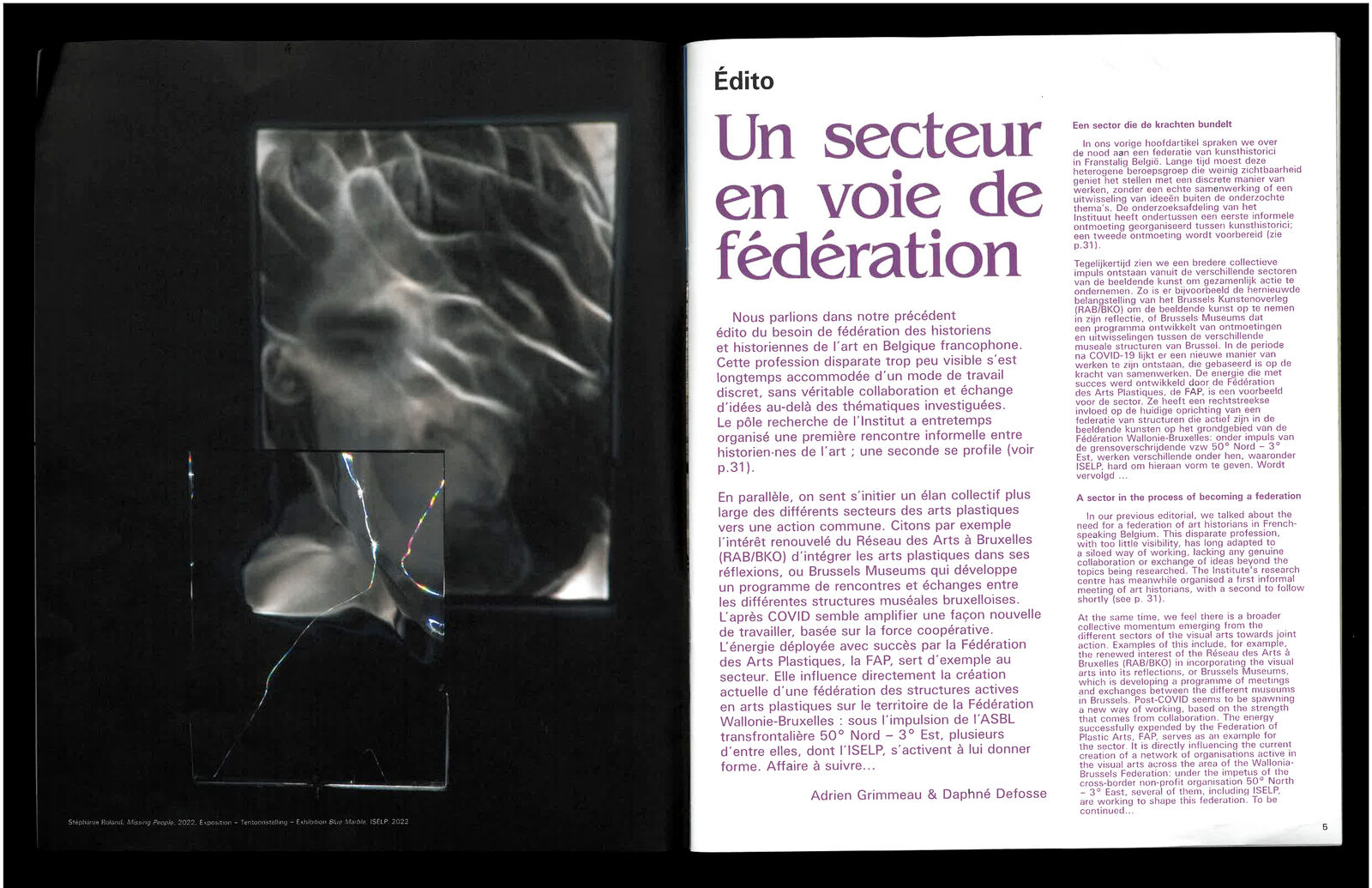 Création des revues trimestrielles de l'ISELP dans laquelle on y retrouve la programmation du lieu (expositions, évènements, résidences...)