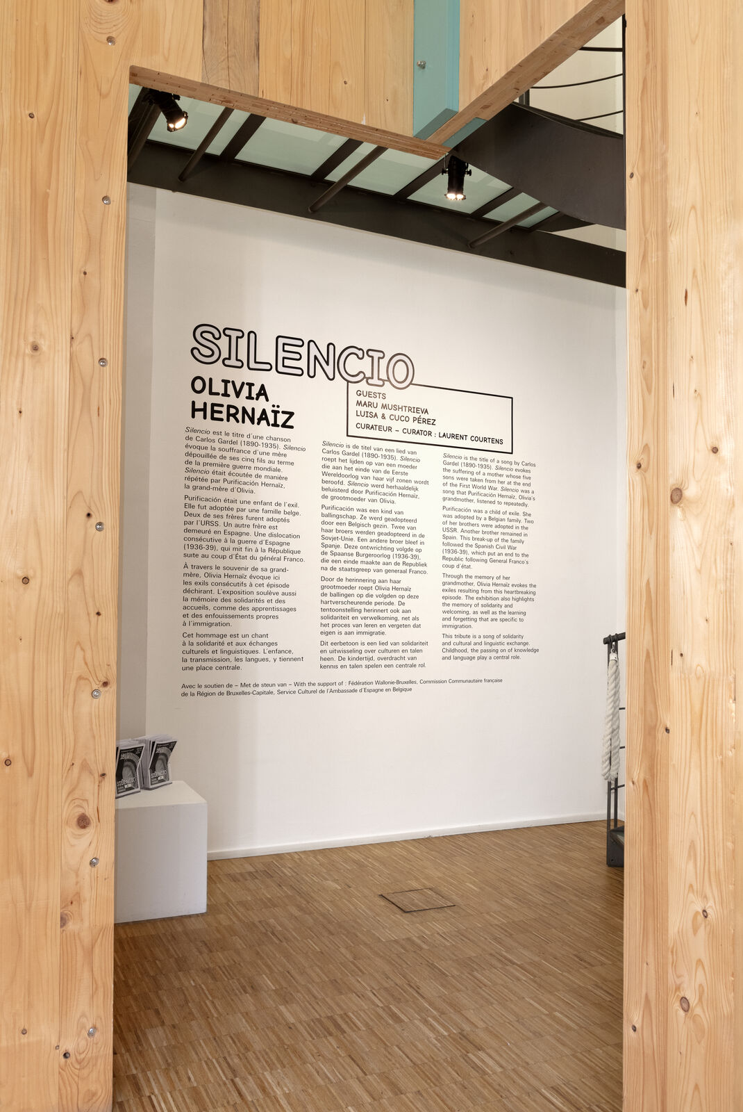 Mise en espace des textes d'introduction des expositions présentées à l'ISELP, ainsi que d'une chanson choisie par l'artiste Olivia Hernaïz en lettrage doré sur fond rouge. Photo ©JJSerol