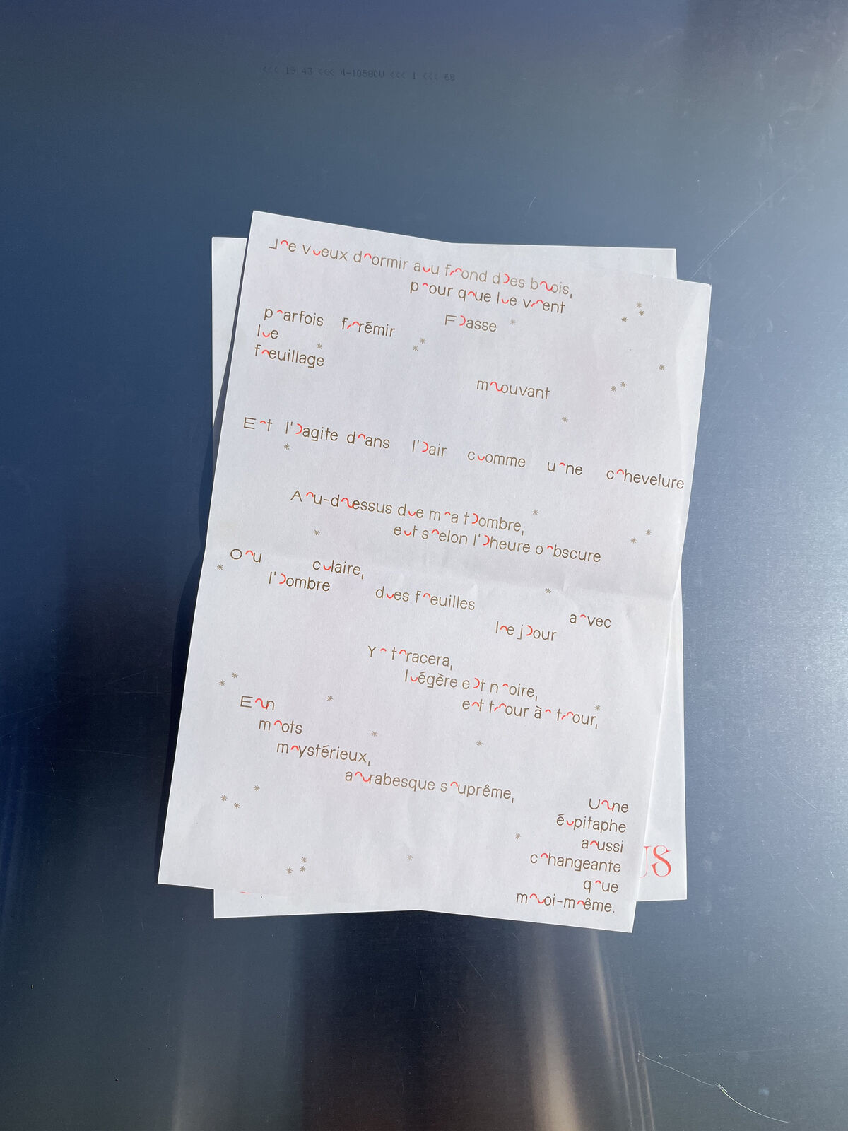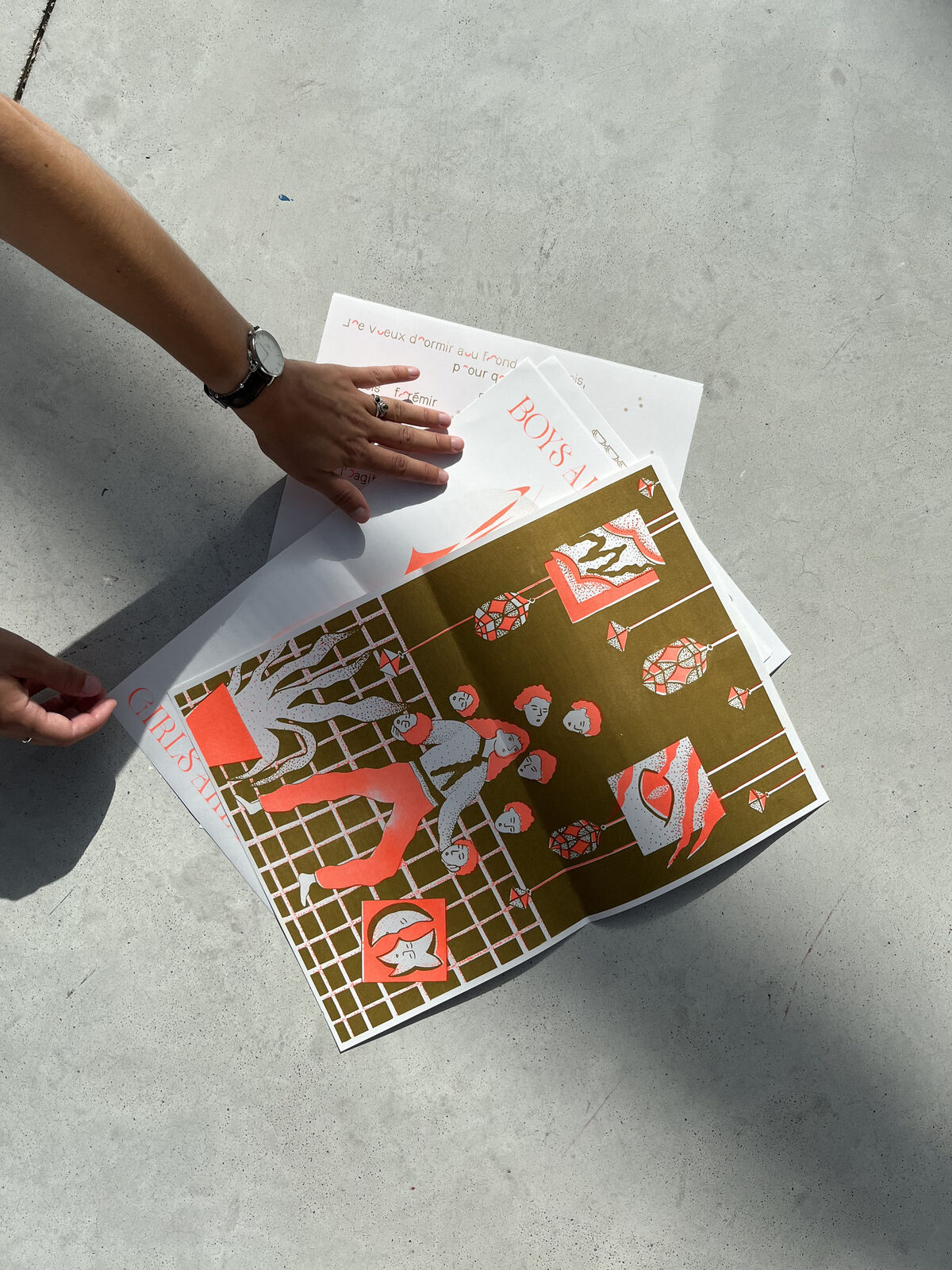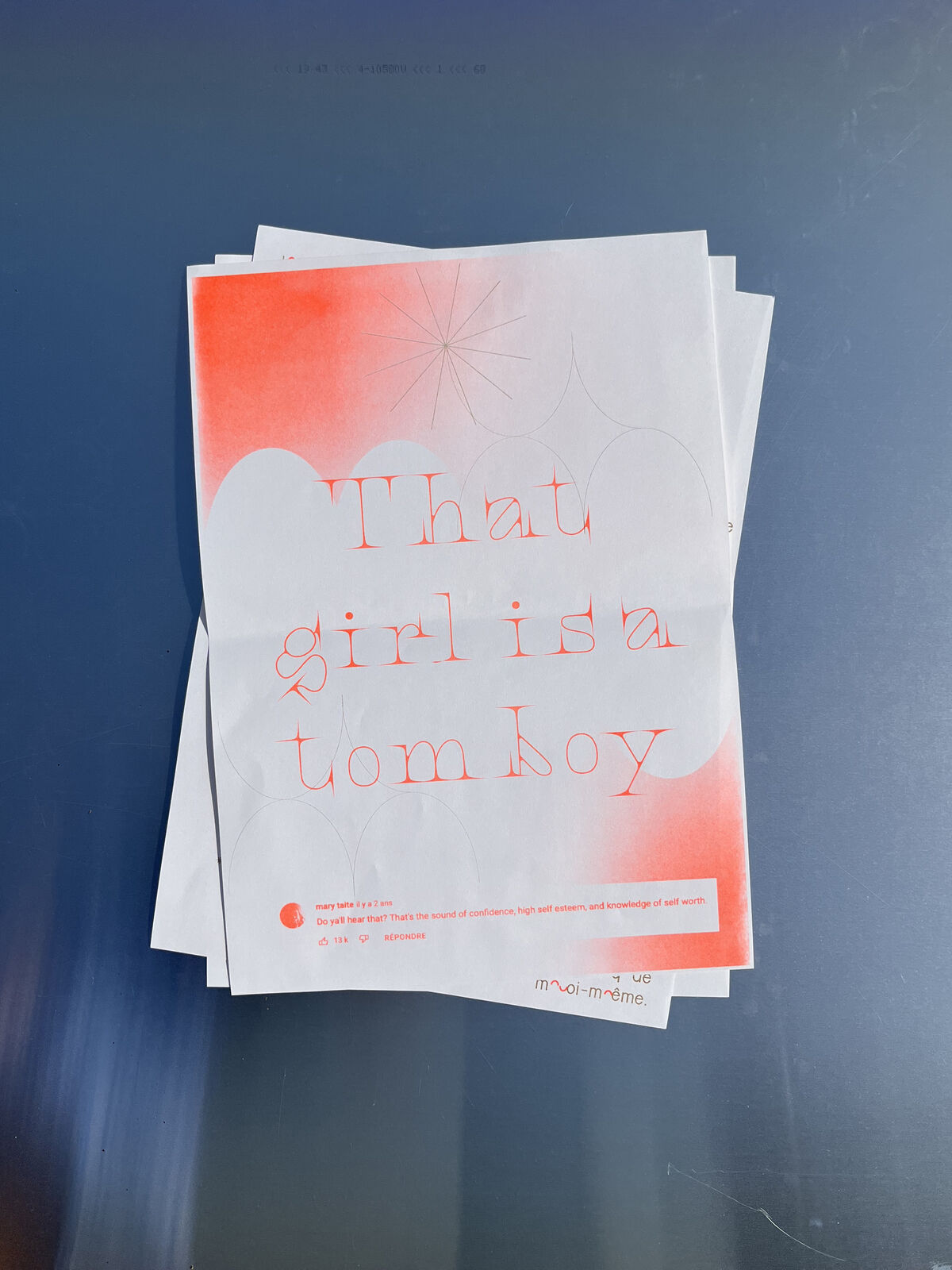 Édition de 6 affiches imprimées en risographie, deux couleurs, d’après les écrits de Virginie Despentes, Gérard d’Houville alias Marie de Heredia ou de Régnier et Irene. Ainsi que les musiques des rappeuses Princess Nokia et Lous and the Yakuza. Au recto on retrouve des compositions graphiques textuelles et visuelles associées à chaque oeuvres des femmes artistes et au verso les références des ouvrages ainsi que le contenu intégral des paroles de musique de rap. Format A3, 15€/l'édition ; 6 affiches, 8€/l'affiche orange et gold, reliure élastique A4, 30 éditions limitées numérotées.