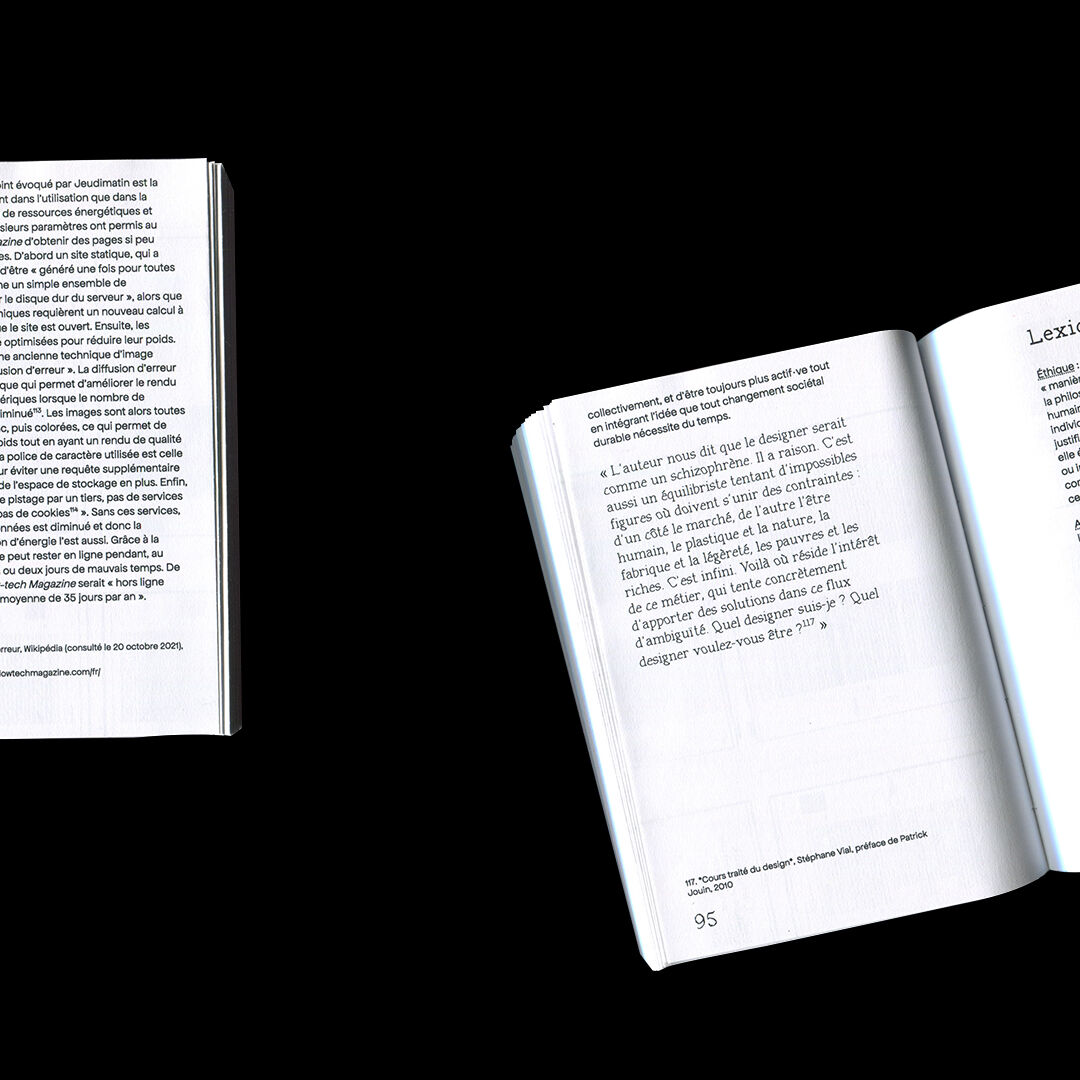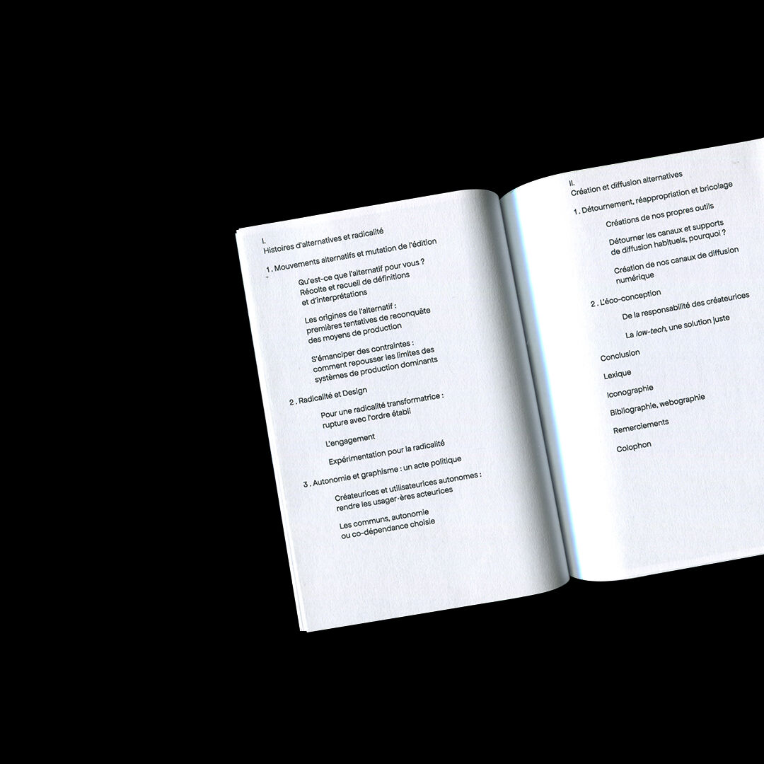 Mémoire de DNSEP en design graphique réalisé à l'ESAD de Valence en 2022. Il traite des questions de l'alternatif en design, que ce soit d'ordre écologique, économique, politique ou social. Les notions d'engagement, de radicalité y sont très importantes. Aussi j'y aborde la notion d'autonomie, non pas d'autonomie complète mais, comme je l'appelle dans ce mémoire, de co-dépendance choisie. On retrouve dans ce mémoire les questions liées aux outils libres, aux moyens d'échanges non-monétaire, aux espaces de travail et aux manière de travailler alternatives. Cette édition a été mise en page grâce à l'outil libre Paged.js. Tous les papiers utilisés sont des feuilles A4 déjà imprimées sur une face que j'ai récupéré au sein de mon école. Sa forme a été induite par le fait que je souhaitais aucune perte de papier : découpé en format A5 puis plié en deux.