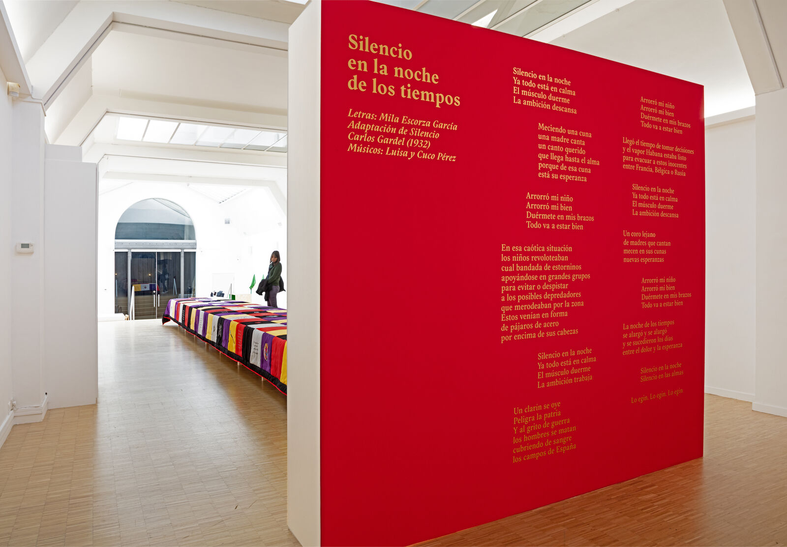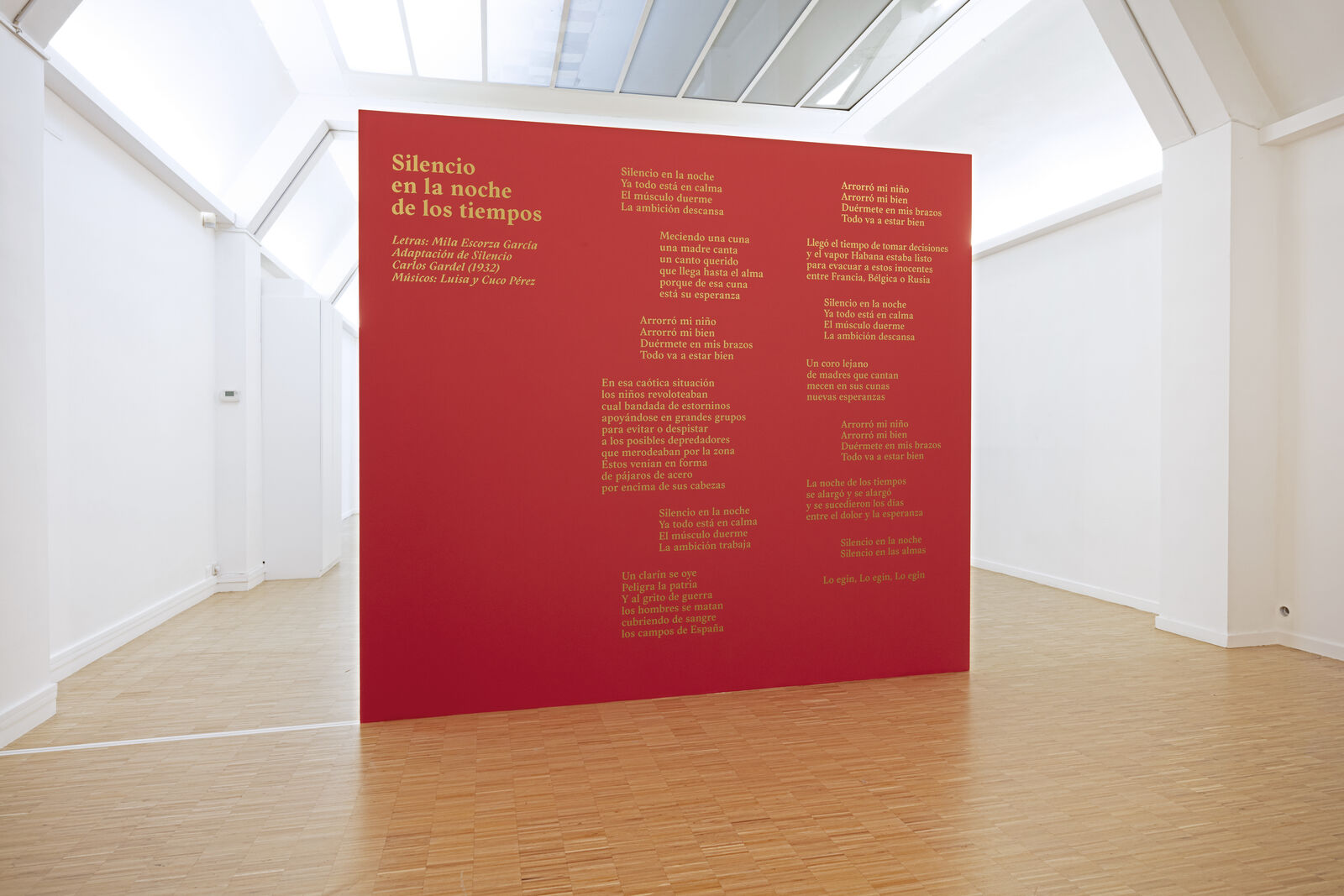 Mise en espace des textes d'introduction des expositions présentées à l'ISELP, ainsi que d'une chanson choisie par l'artiste Olivia Hernaïz en lettrage doré sur fond rouge. Photo ©JJSerol